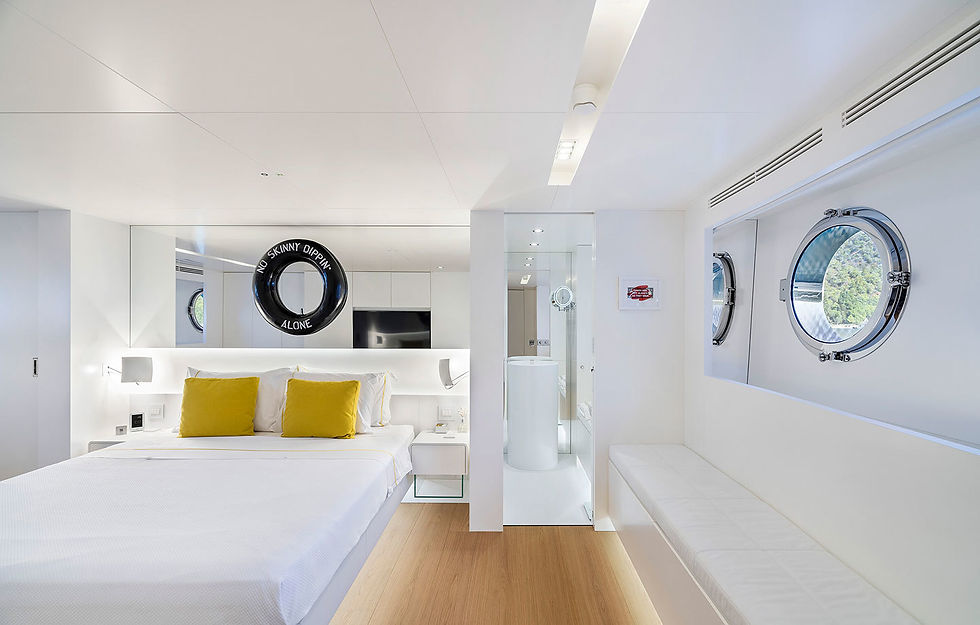 Marine white walls and custom made white lacquer furniture dominate the yacht throughout with accents of yellow. The reflective chrome ceilings help create continuity while playful art and elements bring a casual feel to the military lines of the boat.